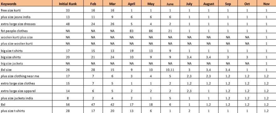 The procedure adopted by us that obtained high impact was step by step. The foremost aspect we focussed on was analysing the best suitable keyword. The first keyword which we extremely gave significance to was “plus size t-shirts for women India”. Initially, it ranked 21st in the list of search engines. With the efficient and talented expert team of digital marketers, we paved their journey to new heights. Today, this keyword ranks first on any search engine given and positions Pluss.in in the superior designation in this industry.